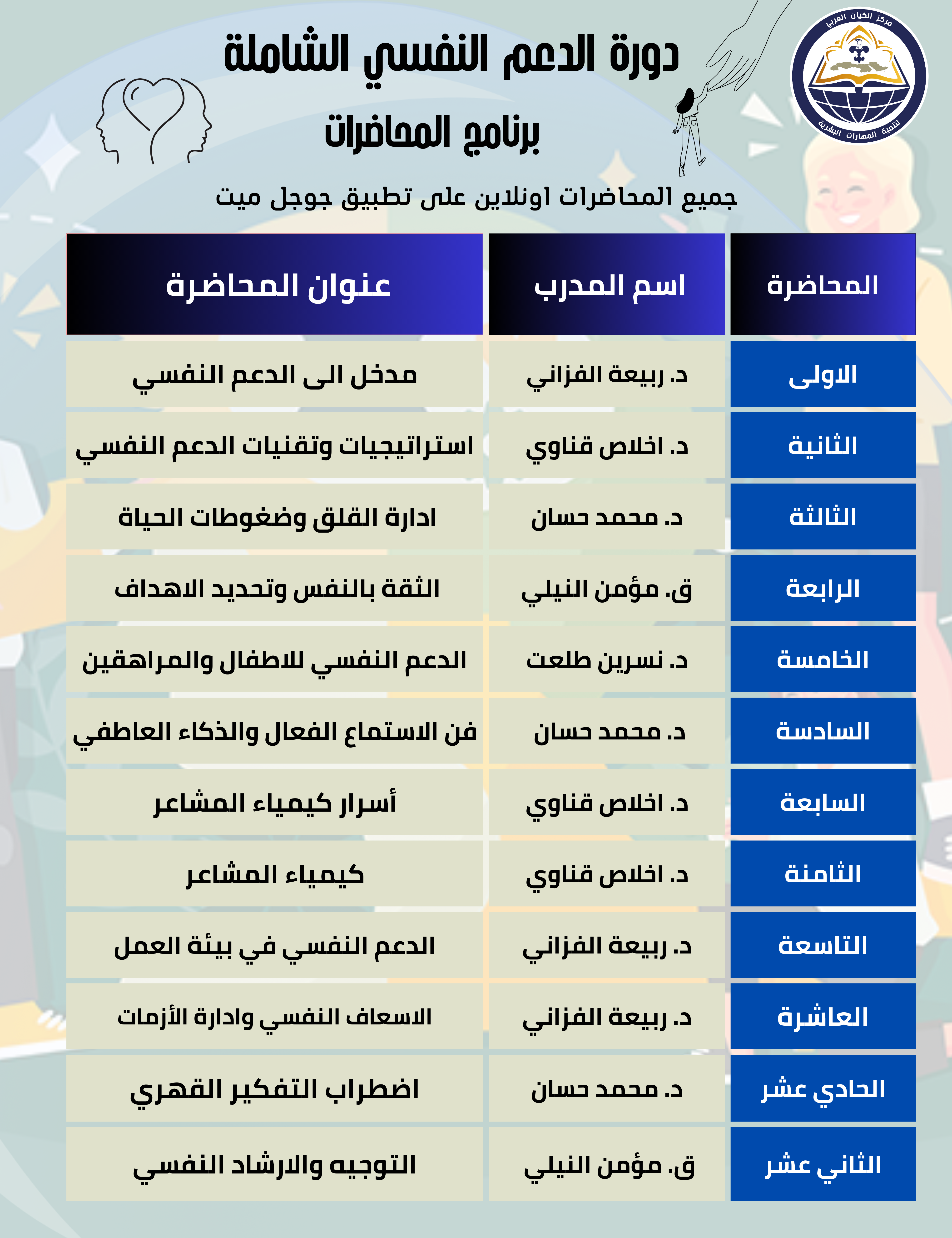 دورة تدريبية متكاملة عبر Google Meet تهدف لتعليم مهارات وتقنيات الدعم النفسي بطريقة عملية، تشمل 12 محاضرة مع شهادات وتسجيلات، مقدَّمة من مركز الكيان العربي للتدريب.