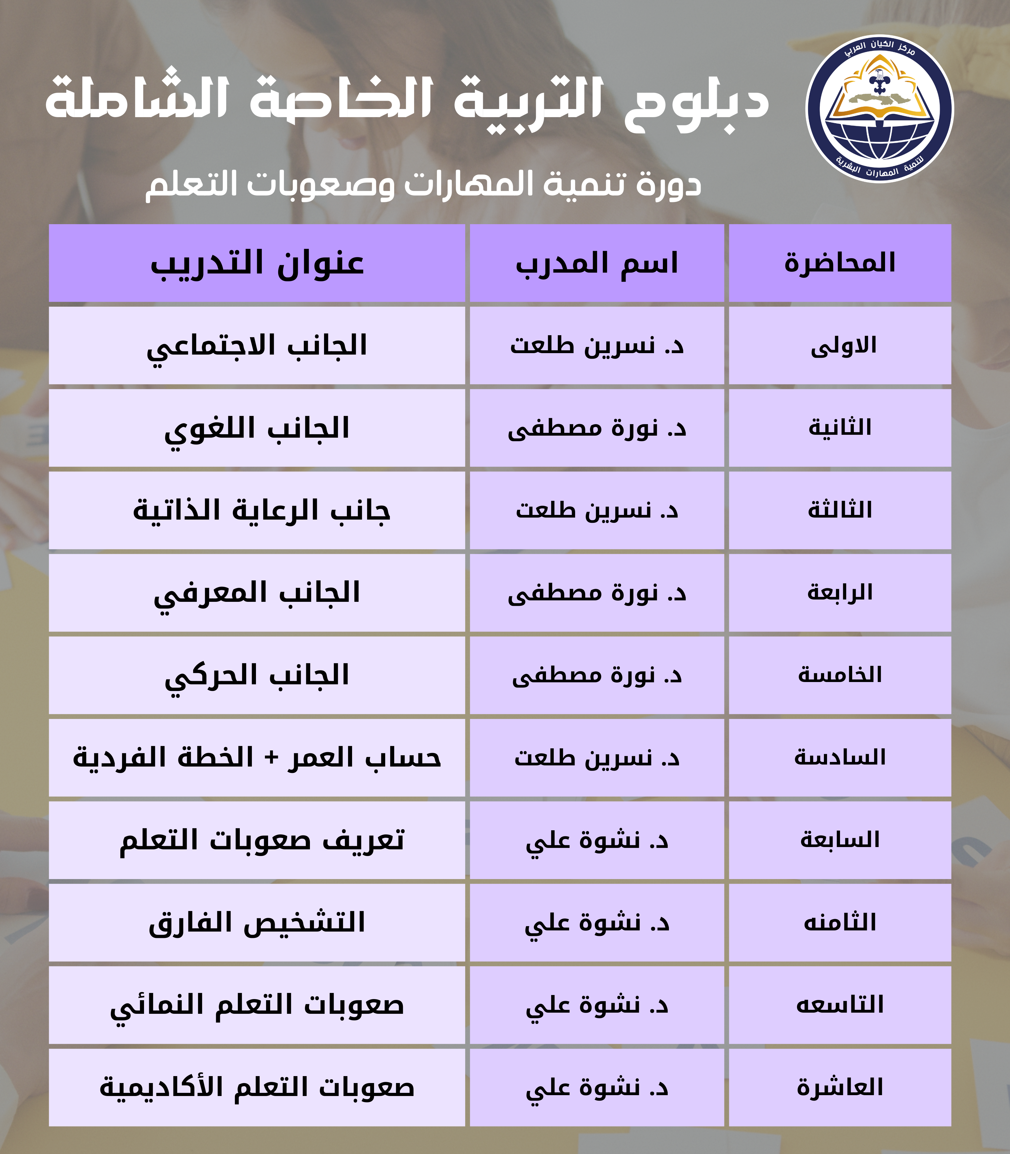 **دورة تنمية المهارات هي وحدة تدريبية متخصصة ضمن دبلومة التربية الخاصة الشاملة، وتهدف إلى تأهيل المتدربين لاكتساب المهارات العملية والعلمية في تقييم وتنمية قدرات الأطفال في مختلف الجوانب النمائية. يتم تقديم الدورة على يد دكاترة متخصصين في الجانب الطبي وخبراء في الجانب التربوي، مما يضمن الدمج بين الرؤية الطبية والتربوية لتحقيق أفضل النتائج.