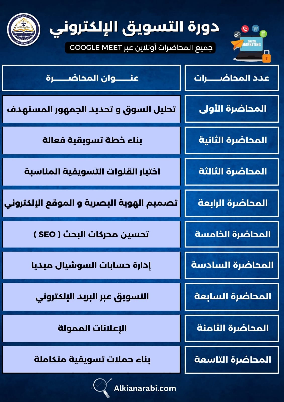 دورة "التسويق الإلكتروني الشاملة" هي برنامج تدريبي عملي ومتكامل، يُقدَّم من خلال محاضرات مباشرة عبر Google Meet على مدار شهر كامل بواقع 12 محاضرة و50 ساعة تدريبية. تهدف الدورة إلى تمكين المتدربين من تخطيط وتنفيذ الحملات التسويقية الرقمية من الألف إلى الياء، باستخدام أدوات الذكاء الاصطناعي التي تُسهّل وتسّـرع العمل، مع التركيز على التطبيق العملي في كل مرحلة.