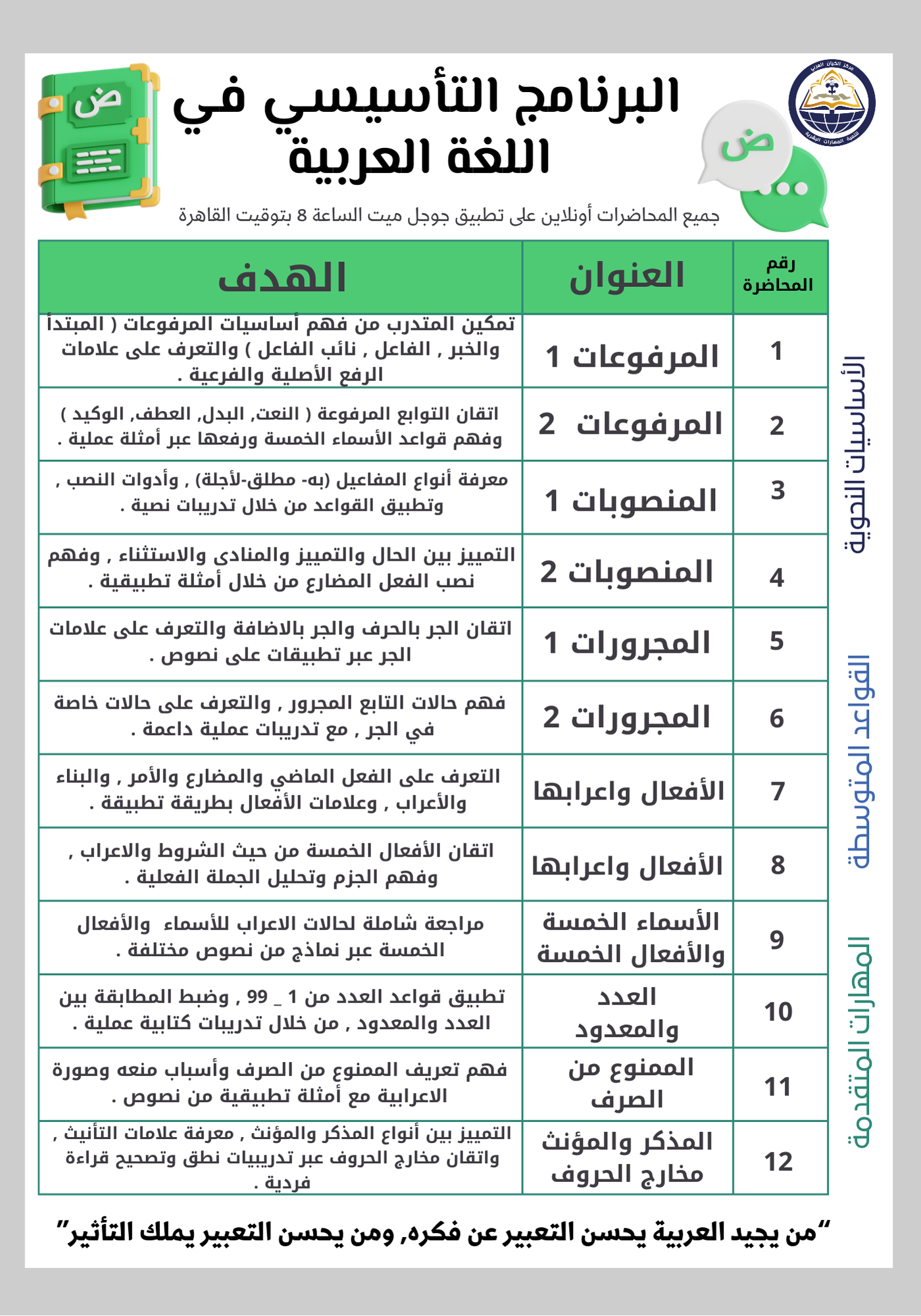 **برنامج تأسيس اللغة العربية يقدم منهجًا تدريبيًا متكاملًا لتأسيس مهارات اللغة العربية من الأساس حتى المستوى المتقدم. يشمل البرنامج 12 محاضرة موزعة على 3 مستويات: • المستوى الأول: المرفوعات والمنصوبات وأدوات النصب والتوابع الأساسية. • المستوى الثاني: المجرورات والأفعال وبناؤها والإعراب والتحليل. • المستوى الثالث: الأسماء الخمسة، الأفعال الخمسة، العدد والمعدود، الممنوع من الصرف، المذكر والمؤنث، ومخارج الحروف.