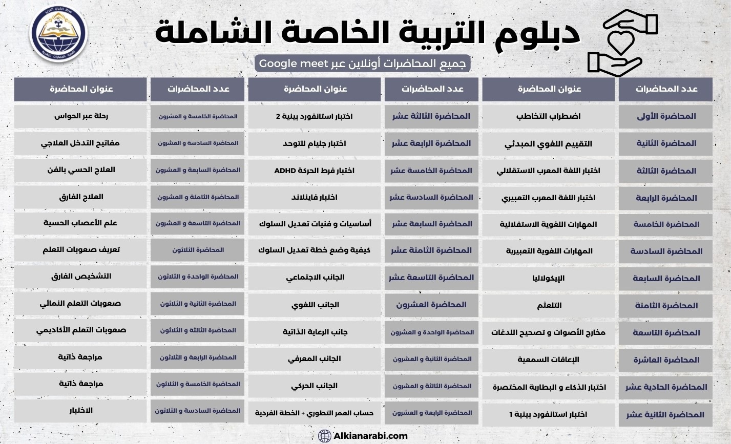 دبلومة التربية الخاصة الشاملة هي برنامج تدريبي متكامل يجمع بين الجانبين الطبي والتربوي، حيث يتم شرح المحاور على يد أساتذة متخصصين في الطب وخبراء في التربية الخاصة وعلم النفس. يهدف البرنامج إلى تأهيل المشاركين بالمعرفة والمهارات العملية للتعامل مع الأطفال ذوي الاحتياجات الخاصة، من خلال دراسة التخاطب، تعديل السلوك، صعوبات التعلم، التكامل الحسي وتنمية المهارات. الدبلومة أونلاين عبر Google Meet بمحاضرات مباشرة تفاعلية، مع إمكانية إعادة مشاهدة التسجيلات والحصول على شهادة معتمدة.